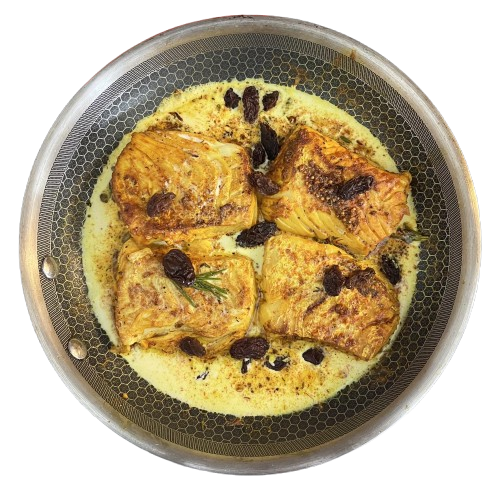 Marinate the cod with extra virgin olive oil, saffron, oregano, salt, and rosemary (optional).