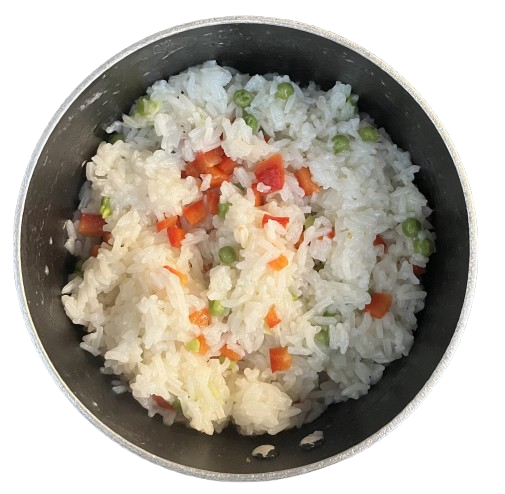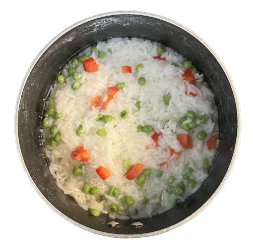 Pour water (1 cup) into a pot with the jasmine rice, red peppers, and green peas.