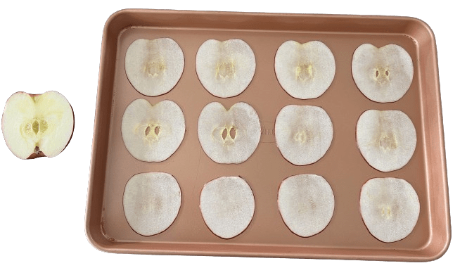 Place another baking tray directly on top of the baking tray with the apple slices to apply pressure lightly.