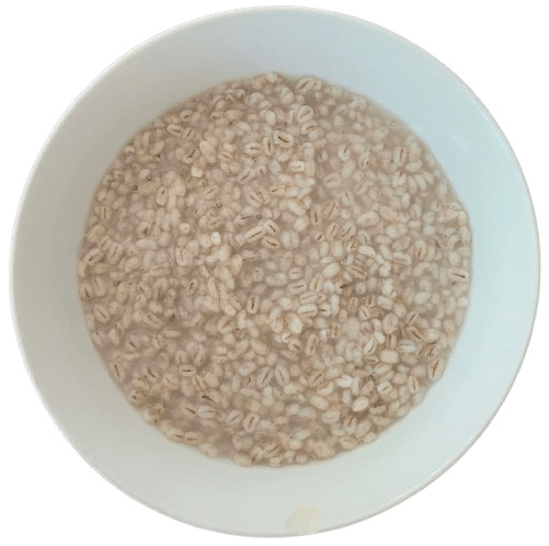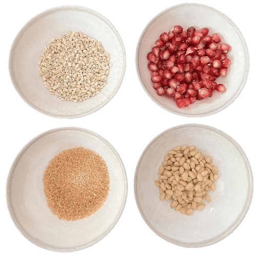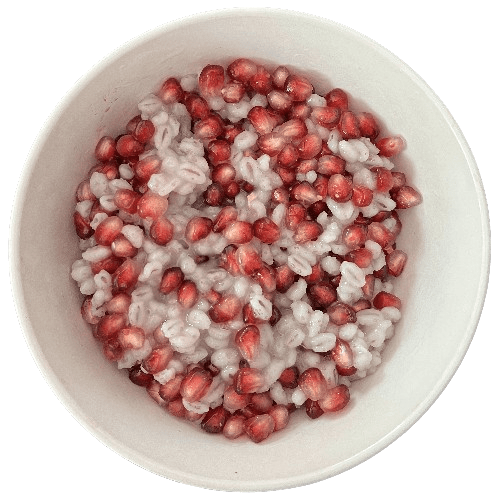 Mix the pomegranate, peeled barley, sliced almonds, pine nuts, brown sugar, and rose water.