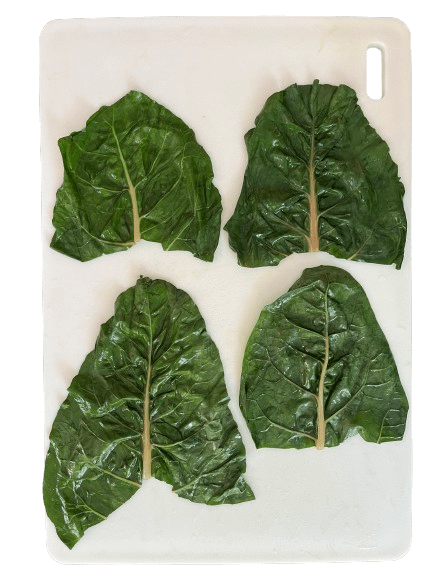 Blanche swiss chard leaves in boiling water for 30 seconds.