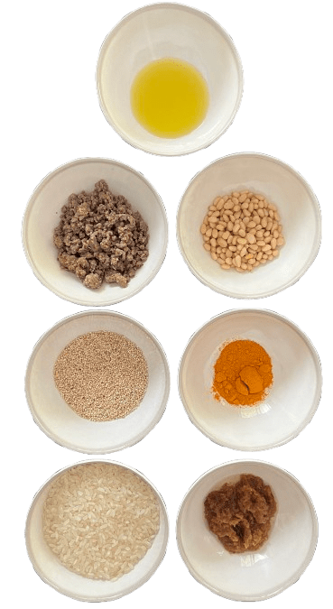 Place the ground beef, sushi rice, quinoa, cooked onion, pine nuts, and turmeric in a bowl.