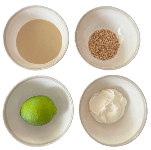 Pour the tahini sauce, yogurt, lime juice, and sesame seeds.