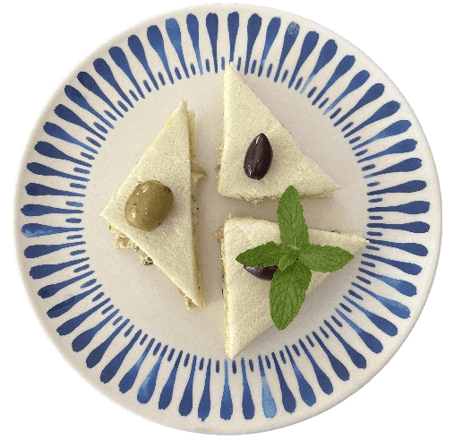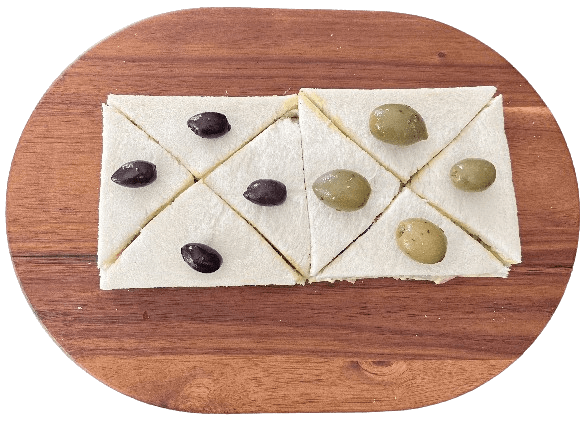 Shape the toast by cutting it into triangles and place an olive for a salty garnish.