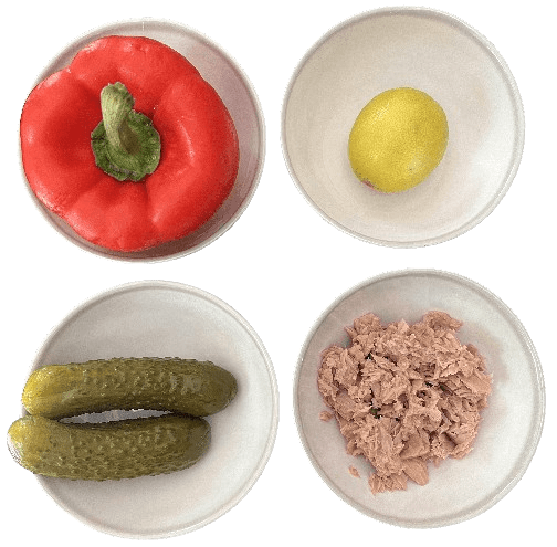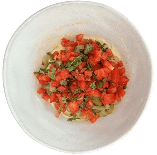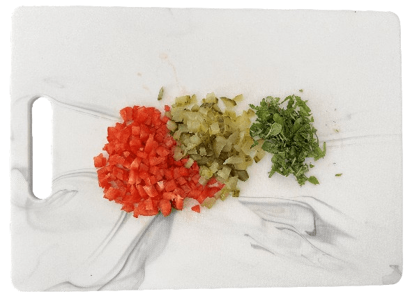 Add the finely diced red pepper, pickles, and mint.